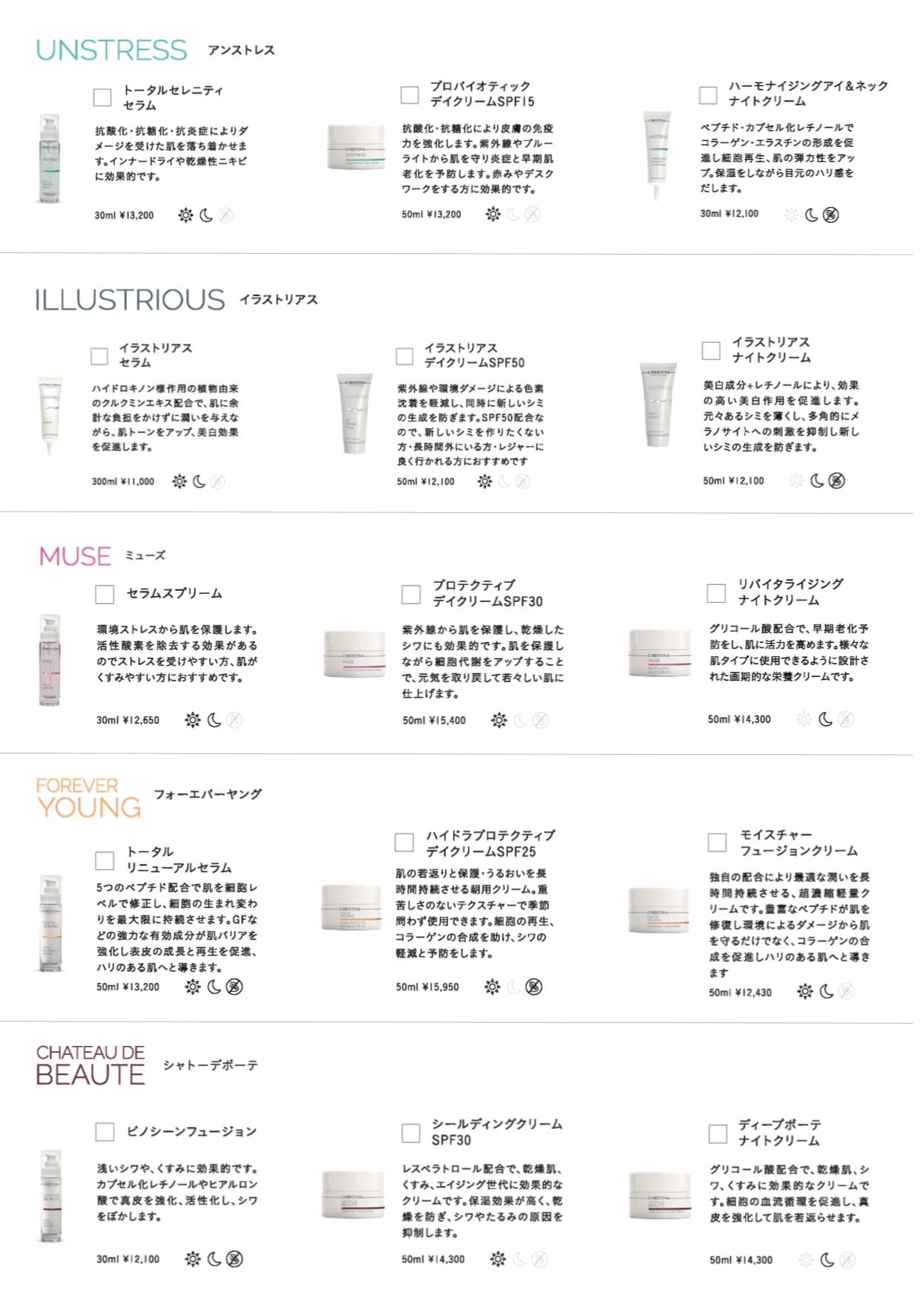 セラム、デイクリーム、ナイトクリーム